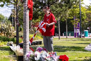 (250703) — LIVERPOOL, 3 julio, 2025 (Xinhua) — Una aficionada rinde tributo a Diogo Jota afuera del estadio Anfield, en Liverpool, Reino Unido, el 3 de julio de 2025. El delantero internacional portugués Diogo Jota, del Liverpool, y su hermano André murieron en la madrugada del jueves en un accidente automovilístico en el noreste de España, según las autoridades españolas. (Xinhua) (rtg) (vf)