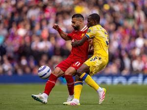 (250526) -- LIVERPOOL, 26 mayo, 2025 (Xinhua) -- Imagen del 25 de mayo de 2025 de Mohamed Salah (i), de Liverpool, disputando el balón con Tyrick Mitchell, de Crystal Palace, durante el partido de la Premier League inglesa entre Liverpool y Crystal Palace, en el estadio Anfield, en Liverpool, Reino Unido. (Xinhua) (oa) (ah) (ce) ***SOLO USO EDITORIAL*** ***NO A LA VENTA PARA CAMPAÑAS DE MARKETING O PUBLICIDAD. PROHIBIDO EL USO CON AUDIO, VIDEO, DATOS, LISTAS DE PARTIDOS, LOGOTIPOS DE CLUBES/LIGAS O SERVICIOS "EN VIVO" NO AUTORIZADOS. USO EN LINEA DURANTE EL PARTIDO LIMITADO A 45 IMAGENES, SIN EMULACION DE VIDEO. PROHIBIDO SU USO EN APUESTAS, PARTIDOS O PUBLICACIONES DE UN SOLO CLUB, LIGA O JUGADOR***