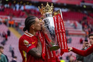 (250526) -- LIVERPOOL, 26 mayo, 2025 (Xinhua) -- Imagen del 25 de mayo de 2025 de Darwin Núñez, de Liverpool, besando el trofeo de campeón al término del partido de la Premier League inglesa entre Liverpool y Crystal Palace, en el estadio Anfield, en Liverpool, Reino Unido. (Xinhua) (oa) (ah) (ce) ***SOLO USO EDITORIAL*** ***NO A LA VENTA PARA CAMPAÑAS DE MARKETING O PUBLICIDAD. PROHIBIDO EL USO CON AUDIO, VIDEO, DATOS, LISTAS DE PARTIDOS, LOGOTIPOS DE CLUBES/LIGAS O SERVICIOS "EN VIVO" NO AUTORIZADOS. USO EN LINEA DURANTE EL PARTIDO LIMITADO A 45 IMAGENES, SIN EMULACION DE VIDEO. PROHIBIDO SU USO EN APUESTAS, PARTIDOS O PUBLICACIONES DE UN SOLO CLUB, LIGA O JUGADOR***