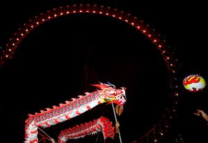 (250129) -- LONDRES, 29 enero, 2025 (Xinhua) -- Imagen del 28 de enero de 2025 de bailarines presentando una danza tradicional china del dragón frente al Ojo de Londres iluminado en rojo para celebrar el Año Nuevo chino, en Londres, Reino Unido. (Xinhua/Li Ying) (jg) (da) (vf)