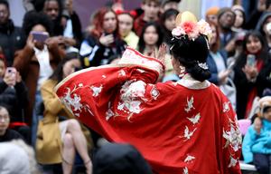 (260222) -- LONDRES, 22 febrero, 2026 (Xinhua) -- Imagen del 21 de febrero de 2026 de personas observando una presentación de trajes tradicionales chinos durante una celebración del Año Nuevo chino, en el Mercado de Camden, en Londres, Reino Unido. (Xinhua/Li Ying) (rtg) (ah)