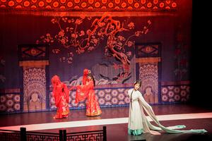 (250823) -- LONDRES, 23 agosto, 2025 (Xinhua) -- Imagen del 21 de agosto de 2025 de artistas de la Compañía de Ópera Xiaobaihua Yue, de la provincia de Zhejiang, en el este de China, realizando una presentación de un fragmento de "El Jardín del Amor" en el Teatro Shaw, en Londres, Reino Unido. La Compañía de Ópera Xiaobaihua Yue, de la provincia de Zhejiang, en el este de China, presentó aquí un programa especial con fragmentos de los clásicos chinos "Los Amantes Mariposa" y "El Jardín del Amor" a partir del jueves. Durante dos noches, las presentaciones atrajeron a más de 800 espectadores. (Xinhua/Wu Lu) (jg) (da)