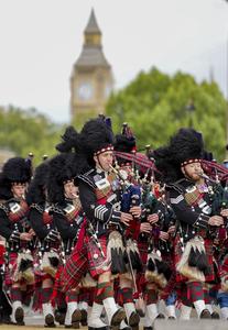 (250506) -- LONDRES, 6 mayo, 2025 (Xinhua) -- Imagen del 5 de mayo de 2025 de gaiteros participando en la procesión militar, en Londres, Reino Unido. Reino Unido realizó procesiones militares y un sobrevuelo de la Real Fuerza Aérea el lunes para conmemorar el 80 aniversario del Día de la Victoria en Europa. (Xinhua/Wu Lu) (jg) (ra) (vf)