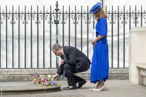 (250509) -- LONDRES, 9 mayo, 2025 (Xinhua) -- Imagen del 8 de mayo de 2025 del primer ministro británico, Keir Starmer (i), depositando flores tras un servicio de acción de gracias para conmemorar el 80 aniversario del Día VE, o Día de la Victoria en Europa, en la Abadía de Westminster, en Londres, Reino Unido. (Xinhua) (jg) (da) (vf)