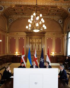 (251025) -- LONDRES, 25 octubre, 2025 (Xinhua) -- Imagen del 24 de octubre de 2025 del primer ministro británico, Keir Starmer (c), el presidente ucraniano, Volodymyr Zelensky (2-i), el secretario general de la Organización del Tratado del Atlántico Norte (OTAN), Mark Rutte (2-d), la primera ministra danesa, Mette Frederiksen (i), y el primer ministro neerlandés, Dick Schoof, asistiendo a una reunión de la "Coalición de los Voluntarios", en Londres, Reino Unido. Los líderes europeos y el jefe de la OTAN se comprometieron el viernes a intensificar las sanciones contra Rusia y acelerar la entrega de armas de ataque de largo alcance y defensa aérea a Ucrania, tras una reunión de la "Coalición de los Voluntarios" celebrada en Londres. (Xinhua/Simon Dawson/Número 10 de Downing Street) (jg) (da) ***SOLO USO EDITORIAL***