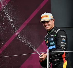 (250707) — LONDRES, 7 julio, 2025 (Xinhua) — Imagen del 6 de julio de 2025 del piloto británico de la escudería McLaren, Lando Norris, festejando durante la ceremonia de premiación del Gran Premio de Reino Unido de Fórmula Uno 2025, en el Circuito de Silverstone, en Londres, Reino Unido. (Xinhua/Li Ying) (rtg) (ah) (vf)