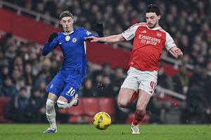 (260204) -- LONDRES, 4 febrero, 2026 (Xinhua) -- Imagen del 3 de febrero de 2026 de Cole Palmer (i), de Chelsea, disputando el balón con Declan Rice, de Arsenal, durante el partido de la semifinal de vuelta de la Copa de la Liga Inglesa de Fútbol entre Arsenal y Chelsea, en Londres, Reino Unido. (Xinhua) (ah) (ra) (vf)