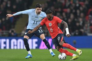 (260328) -- LONDRES, 28 marzo, 2026 (Xinhua) -- Imagen del 27 de marzo de 2026 de Noni Madueke (d), de Inglaterra, disputando el balón con Joaquín Piquerez, de Uruguay, durante un partido amistoso internacional de fútbol entre Inglaterra y Uruguay, en Londres, Reino Unido. (Xinhua) (rtg) (da)