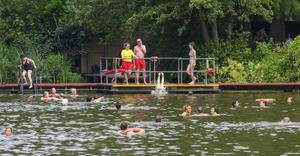 (250621) -- LONDRES, 21 junio, 2025 (Xinhua) -- Imagen del 20 de junio de 2025 de personas nadando en un estanque en Hampstead Heath, en Londres, Reino Unido. Reino Unido registró el jueves su día más caluroso del año al tiempo que se emitió una alerta sanitaria ámbar por calor en toda Inglaterra. (Xinhua) (oa) (da)