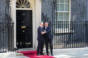 (250710) -- LONDRES, 10 julio, 2025 (Xinhua) -- El primer ministro británico, Keir Starmer (i), recibe al presidente francés, Emmanuel Macron, en el número 10 de Downing Street, en Londres, Reino Unido, el 10 de julio de 2025. Starmer dijo el jueves que Reino Unido y Francia firmaron un nuevo acuerdo para permitir que por primera vez los dos países coordinen su disuasión nuclear. (Xinhua/Wu Lu) (da) (ra) (vf)