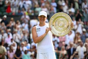 (250713) -- LONDRES, 13 julio, 2025 (Xinhua) -- Imagen del 12 de julio de 2025 de Iga Swiatek posando con su trofeo durante la ceremonia de premiación al término de la final de individuales femeninos entre Iga Swiatek, de Polonia, y Amanda Anisimova, de Estados Unidos, en el Campeonato de Tenis de Wimbledon, en Londres, Reino Unido. (Xinhua/Zhao Dingzhe) (rtg) (da)