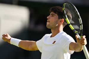 (250701) -- LONDRES, 1 julio, 2025 (Xinhua) -- Imagen del 30 de junio de 2025 de Carlos Alcaraz reaccionando al término del partido de primera ronda de individuales masculinos entre Carlos Alcaraz, de España, y Fabio Fognini, de Italia, en el Campeonato de Tenis de Wimbledon, en Londres, Reino Unido. (Xinhua/Zhao Dingzhe) (oa) (ra) (vf)