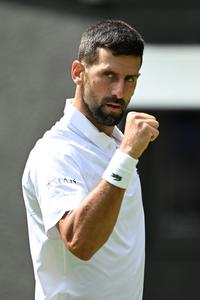 (250704) -- LONDRES, 4 julio, 2025 (Xinhua) -- Imagen del 3 de julio de 2025 de Novak Djokovic reaccionando durante el partido de segunda ronda de individuales masculinos entre Novak Djokovic, de Serbia, y Daniel Evans, de Reino Unido, en el Campeonato de Tenis de Wimbledon, en Londres, Reino Unido. (Xinhua/Zhao Dingzhe) (rtg) (ra) (ce)