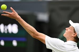 (250706) -- LONDRES, 6 julio, 2025 (Xinhua) -- Imagen del 5 de julio de 2025 de Jannik Sinner, sirviendo la pelota durante el partido de tercera ronda de individuales masculinos entre Jannik Sinner, de Italia, y Pedro Martínez, de España, en el Campeonato de Tenis de Wimbledon, en Londres, Reino Unido. (Xinhua/Zhao Dingzhe) (oa) (ah)