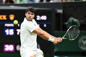 (250707) -- LONDRES, 7 julio, 2025 (Xinhua) -- Imagen del 6 de julio de 2025 de Carlos Alcaraz devolviendo la pelota durante el partido de cuarta ronda de individuales masculinos entre Carlos Alcaraz, de España, y Andrey Rublev, de Rusia, en el Campeonato de Tenis de Wimbledon, en Londres, Reino Unido. (Xinhua/Zhao Dingzhe) (rtg) (ah) (vf)