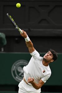 (250707) -- LONDRES, 7 julio, 2025 (Xinhua) -- Imagen del 6 de julio de 2025 de Carlos Alcaraz devolviendo la pelota durante el partido de cuarta ronda de individuales masculinos entre Carlos Alcaraz, de España, y Andrey Rublev, de Rusia, en el Campeonato de Tenis de Wimbledon, en Londres, Reino Unido. (Xinhua/Zhao Dingzhe) (rtg) (ah)