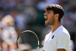 (250711) -- LONDRES, 11 julio, 2025 (Xinhua) -- Carlos Alcaraz reacciona durante el partido de semifinal de individuales masculinos entre Carlos Alcaraz, de España, y Taylor Fritz, de Estados Unidos, en el Campeonato de Tenis de Wimbledon, en Londres, Reino Unido, el 11 de julio de 2025. (Xinhua/Zhao Dingzhe) (oa) (ra) (vf)