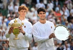 (250714) -- LONDRES, 14 julio, 2025 (Xinhua) -- Imagen del 13 de julio de 2025 de Jannik Sinner (i) y Carlos Alcaraz posando con los trofeos durante la ceremonia de premiación al término de la final de individuales masculinos entre Carlos Alcaraz, de España, y Jannik Sinner, de Italia, en el Campeonato de Tenis de Wimbledon, en Londres, Reino Unido. (Xinhua/Li Ying) (oa) (ah) (vf)