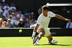(250701) -- LONDRES, 1 julio, 2025 (Xinhua) -- Imagen del 30 de junio de 2025 de Carlos Alcaraz devolviendo la pelota durante el partido de primera ronda de individuales masculinos entre Carlos Alcaraz, de España, y Fabio Fognini, de Italia, en el Campeonato de Tenis de Wimbledon, en Londres, Reino Unido. (Xinhua/Zhao Dingzhe) (oa) (ra) (vf)