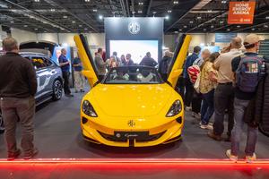(250418) -- LONDRES, 18 abril, 2025 (Xinhua) -- Imagen del 17 de abril de 2025 de personas visitando el estand de la marca china de automóviles MG en Todo Eléctrico Londres, una feria de energía para el hogar y vehículos eléctricos, en Londres, Reino Unido. El evento de tres días comenzó el miércoles en el centro de exposiciones ExCel de Londres. (Xinhua/Ray Tang) (rtg) (ra) (vf)