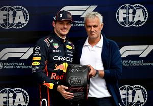 (250706) -- LONDRES, 6 julio, 2025 (Xinhua) -- Imagen del 5 de julio de 2025 del ganador de la pole position, el piloto neerlandés de la escudería Red Bull, Max Verstappen (i), posando con un neumático firmado junto al director técnico de fútbol portugués, José Mourinho, al término de la sesión de clasificación del Gran Premio de Reino Unido de Fórmula Uno 2025, en el Circuito de Silverstone, en Silverstone, Reino Unido. (Xinhua/Li Ying) (rtg) (ah)