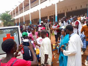 (250626) -- BANGUI, 26 junio, 2025 (Xinhua) -- Imagen del 25 de junio de 2025 de heridos siendo trasladados a una ambulancia, en Bangui, República Centroafricana. Cerca de 20 personas murieron y varias más resultaron heridas el miércoles en una estampida provocada por la explosión de un transformador eléctrico en la Escuela Secundaria Barthelemy Boganda en Bangui, capital de la República Centroafricana, informó el jueves la Asamblea Nacional del país en un comunicado. La Asamblea Nacional dijo que la explosión causó pánico entre los candidatos a los exámenes, lo que provocó una estampida mientras intentaban huir. Las víctimas fueron trasladadas a diversos centros médicos de la capital. (Str/Xinhua) (jg) (da) (vf)