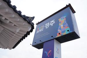 (251031) -- GYEONGJU, 31 octubre, 2025 (Xinhua) -- Imagen del 31 de octubre de 2025 de de un cartel publicitario de la 32ª Reunión de Líderes Económicos del Foro de Cooperación Económica Asia-Pacífico (APEC, por sus siglas en inglés), en Gyeongju, República de Corea. La primera sesión de la 32ª Reunión de Líderes Económicos de APEC se celebró el viernes en Gyeongju. (Xinhua/Jia Haocheng) (oa) (ra) (ce)