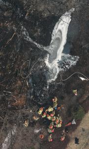 (250326) -- UISEONG, 26 marzo, 2025 (Xinhua) -- Vista aérea tomada con un dron el 26 de marzo de 2025 de bomberos y rescatistas trabajando en el sitio de un accidente de helicóptero de extinción de incendios, en Uiseong, en la provincia de Gyeongsang del Norte, República de Corea. Un piloto murió el miércoles cuando un helicóptero de extinción de incendios se estrelló en la zona sureste de República de Corea mientras combatía incendios forestales mortales, según la agencia de noticias Yonhap. (Xinhua/NEWSIS) (ah) (ra) (vf)