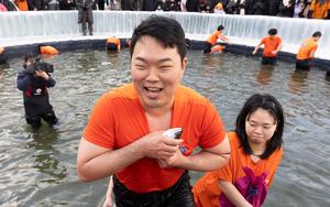 (260110) -- HWACHEON, 10 enero, 2026 (Xinhua) -- Un hombre atrapa peces con las manos desnudas durante el Festival de Hielo Sancheoneo de Hwacheon, en Hwacheon-gun, República de Corea, el 10 de enero de 2026. (Xinhua/Jun Hyosang) (oa) (ra) (ce)