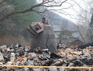 (250327) -- GYEONGSANG, 27 marzo, 2025 (Xinhua) -- Imagen del 27 de marzo de 2025 de un antiguo templo destruido por un incendio, en el distrito de Uiseong, en la provincia de Gyeongsang del Norte, República de Corea. El número de muertos se elevó a 26 y otras 30 personas resultaron heridas, mientras los peores incendios forestales de la historia de República de Corea continuaban arrasando las áreas del sureste, según mostró el jueves una recopilación gubernamental. (Xinhua/Yao Qilin) (jg) (ah) (vf)