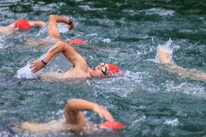 (250706) -- SEUL, 6 julio, 2025 (Xinhua) -- Atletas participan en la competencia de Acuatlón Lotte 2025, que incluye natación en el lago y carrera por el cielo, en Seúl, República de Corea, el 6 de julio de 2025. La competición atrajo a más de 800 participantes. (Xinhua/Park Jintaek) (oa) (ah)