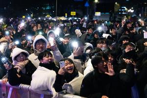 (251231) — SEUL, 31 diciembre, 2025 (Xinhua) — Personas se reúnen en la calle para celebrar el Año Nuevo, en Seúl, República de Corea, el 1 de enero de 2026. (Xinhua/Jun Hyosang) (ah) (vf)
