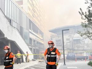 (250528) -- SEUL, 28 mayo, 2025 (Xinhua) -- Imagen tomada con un teléfono móvil de bomberos en el sitio de un incendio, en Seúl, República de Corea, el 28 de mayo de 2025. Un incendio se produjo el miércoles en un antiguo edificio comercial en Seúl, capital de República de Corea, de acuerdo con diversos medios de comunicación. (Xinhua/Huang Xinxin) (jg) (da) (ce)