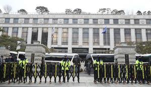(250226) -- SEUL, 26 febrero, 2025 (Xinhua) -- Imagen del 25 de febrero de 2025 de oficiales de policía vistos en servicio frente al Tribunal Constitucional, en Seúl, República de Corea. El Tribunal Constitucional de la República de Corea celebró el martes la undécima y última audiencia del juicio político al presidente Yoon Suk-yeol, quien estuvo presente para dar su declaración final. (Xinhua/Yao Qilin) (ah) (ra) (vf)