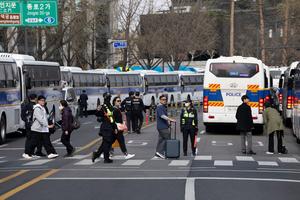 (250403) -- SEUL, 3 abril, 2025 (Xinhua) -- Vehículos policiales están estacionados cerca del Tribunal Constitucional, en Seúl, República de Corea, el 3 de abril de 2025. El presidente surcoreano, Yoon Suk-yeol, y su país se encuentran en un momento crucial, ya que el Tribunal Constitucional del país ha anunciado que emitirá su veredicto sobre el juicio político contra el presidente el viernes. Yoon Suk-yeol decidió no asistir al fallo del Tribunal Constitucional sobre su juicio político, programado para el viernes. (Xinhua/Jun Hyosang) (jg) (ah) (vf)