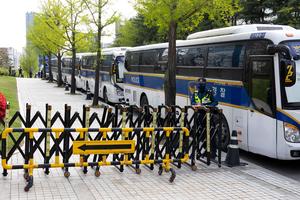 (250421) — SEUL, 21 abril, 2025 (Xinhua) — Un oficial de policía vigila en el Tribunal del Distrito Central de Seúl, en Seúl, República de Corea, el 21 de abril de 2025. El destituido presidente de República de Corea, Yoon Suk-yeol, asistió el lunes a su segundo juicio penal por cargos de insurrección. (Xinhua/Jun Hyosang) (rtg) (ah) (vf)
