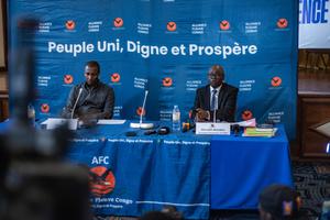 (250703) -- GOMA, 3 julio, 2025 (Xinhua) -- Benjamin Mbonimpa (d), secretario permanente de la Alianza del Río Congo (AFC, por sus siglas en francés) y jefe de su delegación para las conversaciones de Doha, asiste a una conferencia de prensa, en Goma, capital de la provincia de Kivu del Norte, en el este de la República Democrática del Congo, el 3 de julio de 2025. Se espera que una nueva ronda de conversaciones entre el Gobierno de la República Democrática del Congo y el grupo rebelde Movimiento 23 de Marzo (M23) se desarrolle pronto en Doha, la capital de Qatar, dijo el jueves un alto funcionario de la AFC, una coalición político militar aliada del M23. (Xinhua/Zanem Nety Zaidi) (jg) (ah) (ce)