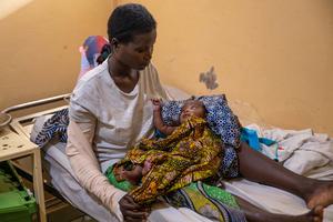(250511) -- GOMA, 11 mayo, 2025 (Xinhua) -- Imagen del 10 de mayo de 2025 de una madre herida cuidando de su bebé en el Hospital Ndosho, en Goma, en la República Democrática del Congo (RDC). El Hospital Ndosho, ubicado en Goma, la ciudad capital de la provincia de Kivu del Norte, en el este de RDC, ha construido casas de campaña provisionales en su estacionamiento para aliviar la presión e incrementar su capacidad de camas a aproximadamente 130, mientras la situación de seguridad en el este de RDC se ha deteriorado en los años recientes. (Xinhua/Zheng Yangzi) (rtg) (da)