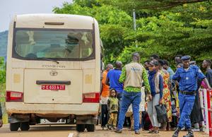 (251126) -- KIGALI, 26 noviembre, 2025 (Xinhua) -- Imagen del 25 de noviembre de 2025 de refugiados burundeses que serán repatriados abordando un autobús en el puesto fronterizo de Nemba-Gasenyi, entre Ruanda y Burundi. Un total de 115 refugiados burundeses, muchos de los cuales huyeron a Ruanda en 2015 debido a la inestabilidad política, han sido repatriados voluntariamente a su país de origen, según un funcionario del Ministerio de Ruanda a cargo de la Gestión de Emergencias. (Xinhua/Cyril Ndegeya) (ah) (ra) (ce)