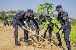 (260201) -- KIGALI, 1 febrero, 2026 (Xinhua) -- Imagen del 31 de enero de 2026 de oficiales de la Policía Nacional de Ruanda plantando un árbol durante el trabajo comunitario mensual Umuganda, en el Humedal Gikondo, en Kigali, Ruanda. Tomando sus raíces en la cultura ruandesa de autoayuda y cooperación, Umuganda, celebrado el último sábado de cada mes, puede traducirse como "unirse con un propósito en común para lograr un resultado", según la Junta de Gobernanza de Ruanda. (Xinhua/Cyril Ndegeya) (rtg) (da)