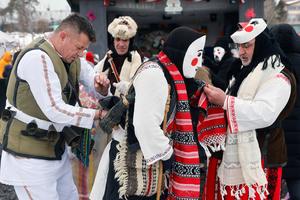 (260223) -- BRANESTI, 23 febrero, 2026 (Xinhua) -- Personas se preparan para el festival anual "Día del Cuco" (Ziua Cucilor), en Branesti, cerca de Bucarest, capital de Rumania, el 23 de febrero de 2026. Grupos de personas enmascaradas participaron en el festival tradicional, cantando y bailando por la buena salud y la fertilidad al comienzo de la primavera. (Xinhua/Cristian Cristel) (oa) (ah) (vf)