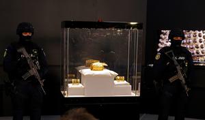 (260422) -- BUCAREST, 22 abril, 2026 (Xinhua) -- Imagen del 21 de abril de 2026 de dos gendarmes vigilando junto a un casco y dos brazaletes de 2.500 años de antigüedad de la antigua cultura dacia en el Museo Nacional de Historia de Rumania, en Bucarest, Rumania. El casco y dos brazaletes fueron recuperados tras haber sido robados de un museo en los Países Bajos y ahora han sido devueltos a Rumania. (Xinhua/Cristian Cristel) (da) (ra) (vf)