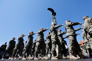 (250720) -- BUCAREST, 20 julio, 2025 (Xinhua) -- Soldados asisten a las celebraciones del Día de la Aviación y de la Fuerza Aérea rumana frente a la Estatua de los Héroes del Aire, en Bucarest, Rumania, el 20 de julio de 2025. (Xinhua/Cristian Cristel) (oa) (ah)