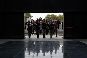(251010) -- BUCAREST, 10 octubre, 2025 (Xinhua) -- Imagen del 9 de octubre de 2025 de miembros de la comunidad judía rumana y una guardia de honor asistiendo a una ceremonia de colocación de ofrenda floral para conmemorar el Día Nacional Rumano de Conmemoración del Holocausto, en Bucarest, Rumanía. (Xinhua/Cristian Cristel) (jg) (da) (vf)