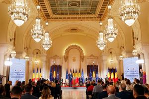 (250430) -- BUCAREST, 30 abril, 2025 (Xinhua) -- Imagen del 29 de abril de 2025 de candidatos a la presidencia de Rumanía asistiendo a un debate electoral organizado por el canal de televisión estatal de Rumanía en el palacio de Cotroceni, en Bucarest, Rumania. Los rumanos votarán en la primera vuelta de las elecciones presidenciales el 4 de mayo. (Xinhua/Cristian Cristel) (ah) (ra) (vf)