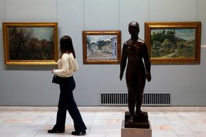 (250518) -- BUCAREST, 18 mayo, 2025 (Xinhua) -- Imagen del 17 de mayo de 2025 de una visitante observando obras de arte en el Museo Nacional de Arte de Rumanía durante el evento de la Noche Europea de los Museos, en Bucarest, Rumanía. Más de 75 museos, que reúnen 210 sedes de todo el país, participan en la 21 edición de la Noche Europea de los Museos 2025. (Xinhua/Cristian Cristel) (oa) (ah)