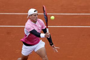 (250407) -- BUCAREST, 7 abril, 2025 (Xinhua) -- Imagen del 6 de abril de 2025 de Sebastián Báez, de Argentina, devolviendo la pelota a Flavio Cobolli, de Italia, durante el partido final del torneo de tenis Abierto de Tiriac de la ATP 250, en Bucarest, Rumania. (Xinhua/Cristian Cristel) (rtg) (ah) (vf)