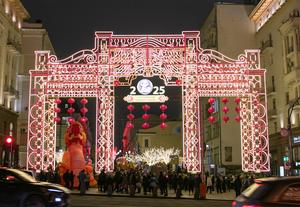 (250128) -- MOSCU, 28 enero, 2025 (Xinhua) -- Personas se reúnen bajo una decoración en celebración del Año Nuevo chino, en el centro de Moscú, Rusia, el 28 de enero de 2025. (Xinhua/Bai Xueqi) (oa) (ah) (vf)