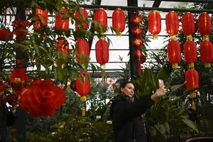 (260208) -- MOSCÚ, 8 febrero, 2026 (Xinhua) -- Imagen del 7 de febrero de 2026 de una visitante tomándose una fotografía con las decoraciones del Festival de la Primavera en el invernadero subtropical del Jardín Botánico de la Universidad Estatal de Moscú, en Moscú, Rusia. (Xinhua/Alexander Zemlianichenko Jr) (oa) (ah)