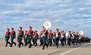 (250507) -- MOSCÚ, 7 mayo, 2025 (Xinhua) -- Miembros de una banda militar son vistos en el aeropuerto, en Moscú, Rusia, 7 de mayo de 2025. El presidente chino, Xi Jinping, llegó el miércoles a Moscú para realizar una visita de Estado a Rusia y asistir a las celebraciones de conmemoración del 80º aniversario de la victoria en la Gran Guerra Patriótica de la Unión Soviética. (Xinhua/Ding Haitao) (jg) (da) (ce)